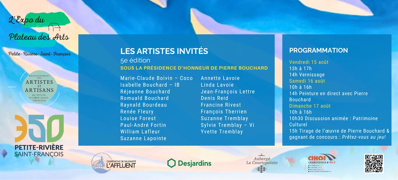 La programmation officielle de la cinquième édition de l’Expo du plateau des Arts se tiendra cette année sous le thème « Portrait de notre histoire » faisant référence au 350e anniversaire de Petite-Rivière-St-François.