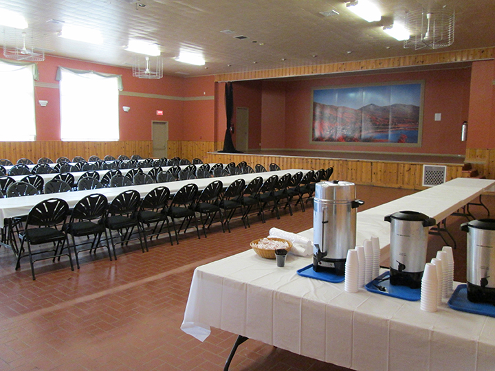 Vaste espace ouvert donnant sur une scène avec écran rétractable, la Grande salle peut accueillir jusqu'à 200 convives pour un repas assis ou alors 400 personnes pour tout autre événement social ou culturel. Cette salle est dotée d’un vestiaire, d’un bar, d’une cuisine et de toilettes.