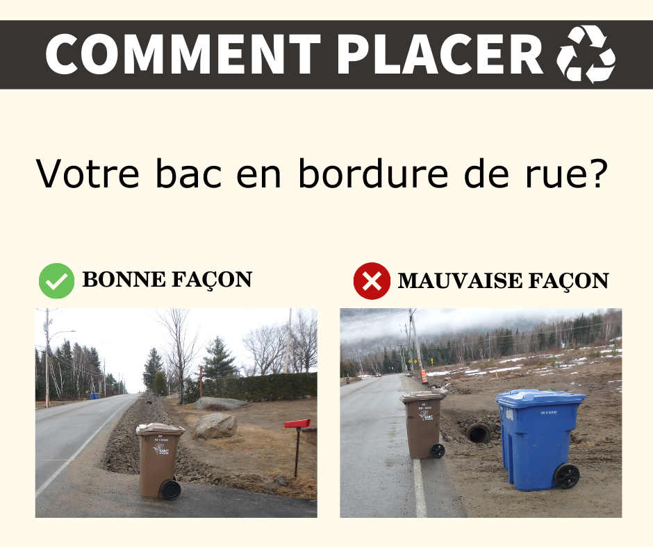 L'équipe des travaux publics tient à souligner que les bacs qui ne sont pas bien positionnés risquent de nuire au déneigement et pourraient être abîmés lors du passage du camion.