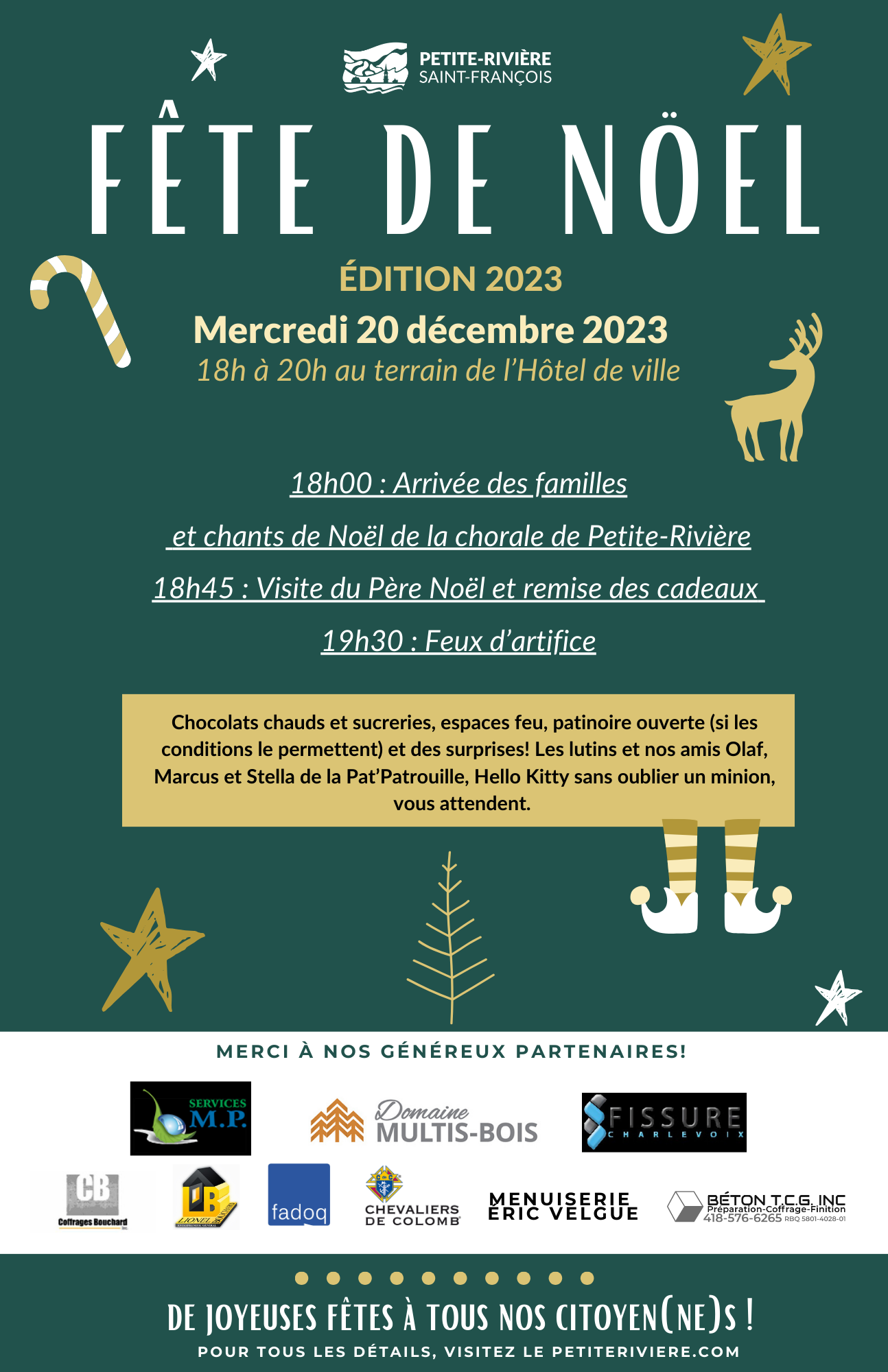 La Municipalité de Petite-Rivière invite les parents ainsi que leurs enfants à participer à la Fête de Noël, un événement chaleureux qui accueillera la traditionnelle distribution de cadeaux par le Père Noël, mais qui sera aussi une occasion de se rassembler pour débuter la période des fêtes. Le mercredi 20 décembre en soirée, environ 300 personnes sont attendues (enfants, parents et équipe) au terrain de l’Hôtel de ville, qui sera transformé en pôle Nord, le temps d’une soirée. À noter que pour recevoir un cadeau, les parents devaient inscrire leurs enfants à la Liste du Père Noël diffusée par la Municipalité, et ce avant le 4 décembre 2023.