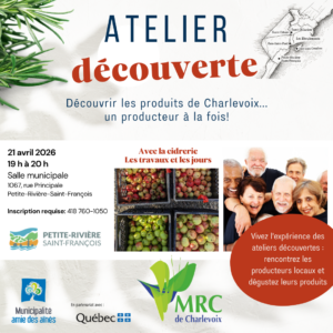 En partenariat avec la MRC de Charlevoix et le Comité MADA, venez participer à un atelier découverte afin de découvrir les produits de Charlevoix, un producteur à la fois !
