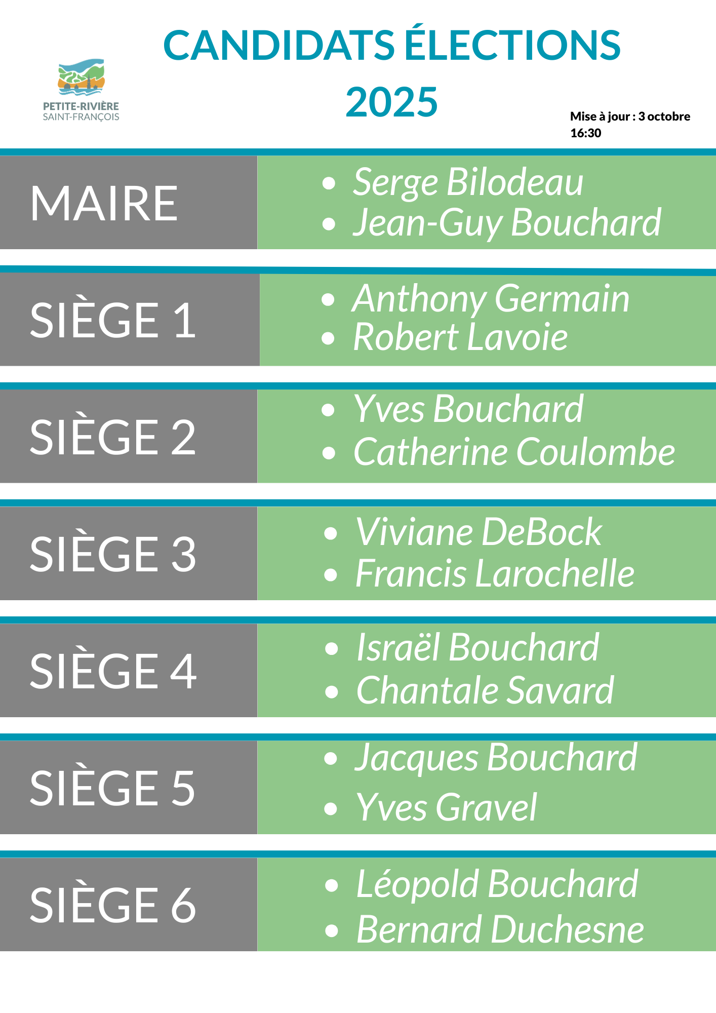 Le dimanche 2 novembre 2025, aux prochaines élections générales municipales, les citoyennes et citoyens de Petite-Rivière-Saint-François seront invités à élire une mairesse ou un maire ainsi que des conseillères et des conseillers qui veilleront à l’administration et au développement éclairé de la Municipalité pour quatre ans.