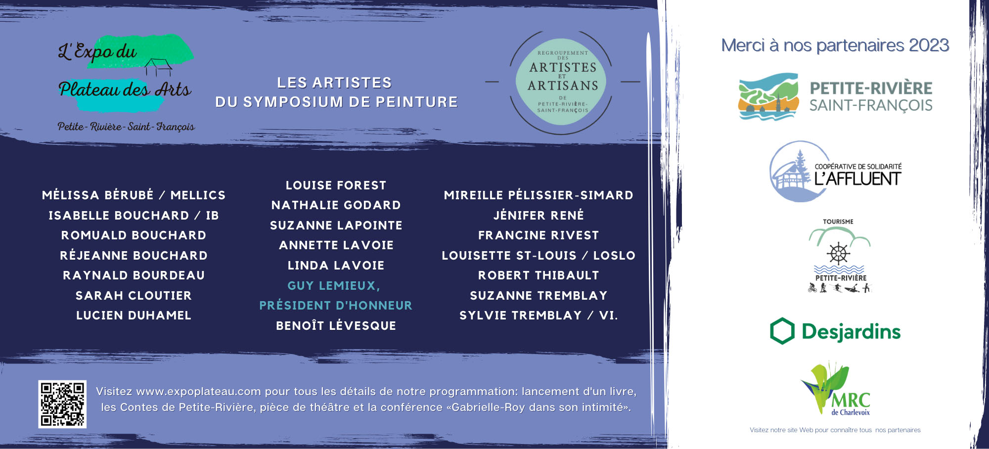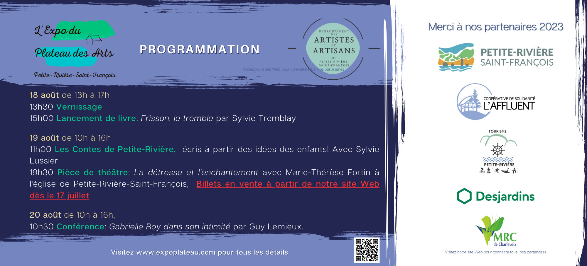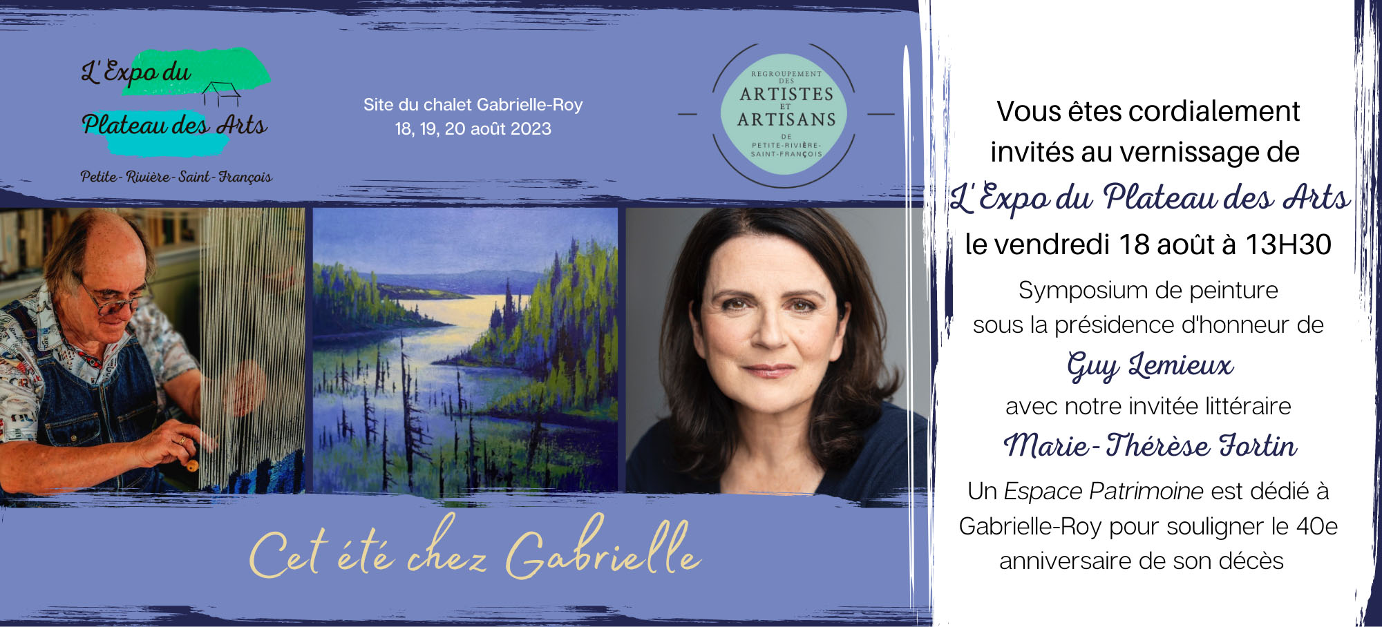 L’équipe de l’Expo du plateau des arts est fière de dévoiler la programmation officielle de sa troisième édition qui se tiendra cette année sous le thème « Cet été chez Gabrielle » du 18 au 20 août 2023 . À l’occasion du quarantième anniversaire du décès de Madame Gabrielle Roy, il était primordial de souligner le lien privilégié que l’écrivaine a entretenu durant des décennies avec notre village.