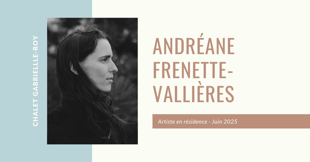 L’artiste littéraire Andréane Frenette-Vallières, originaire de Montréal, a été choisie par le comité de gestion du Chalet Gabrielle-Roy pour occuper la résidence en juin 2025.